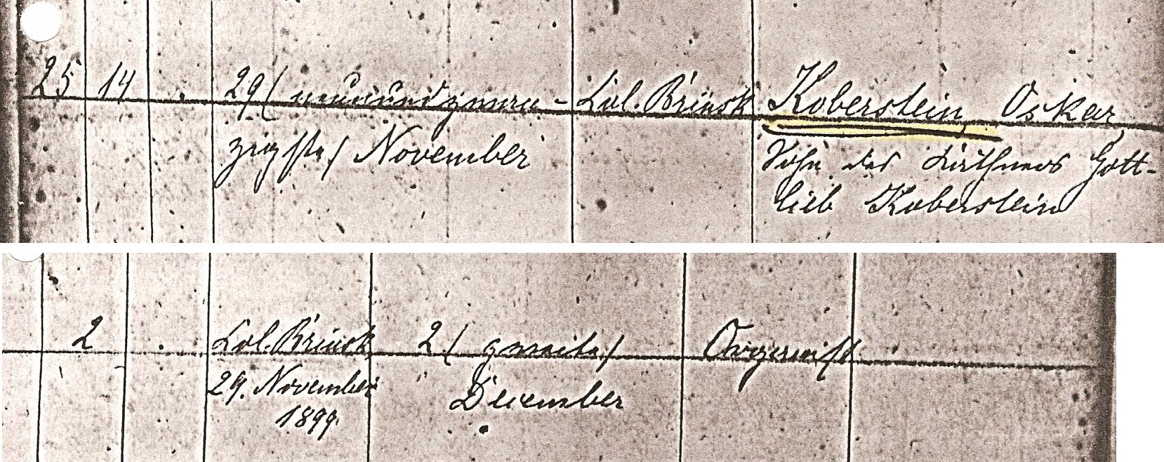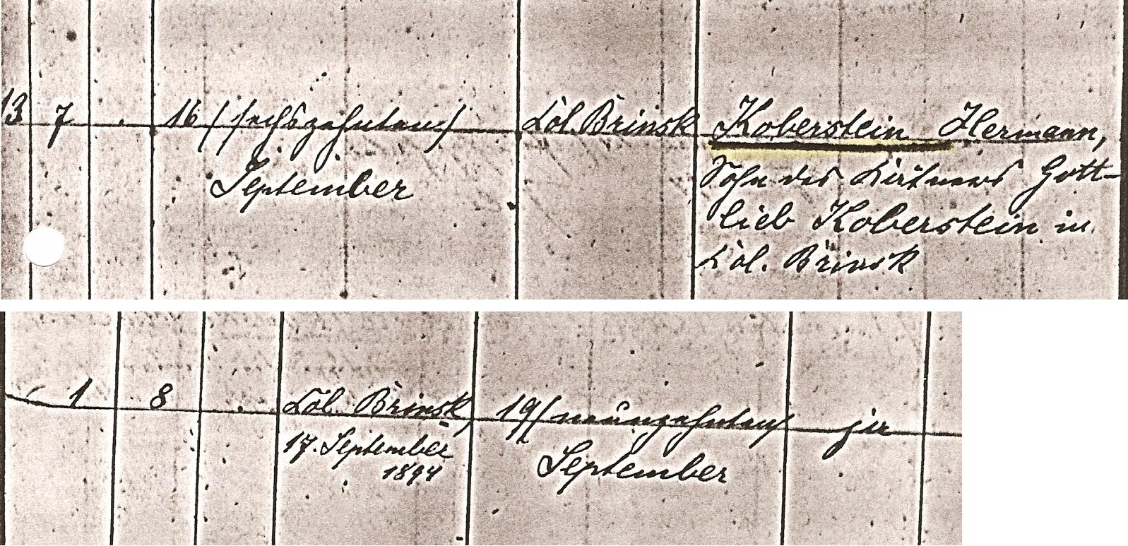 23. August KOBERSTEIN (Gottlieb , Christoph ) was born on 15 Aug 1860 1 in Brinsk, Strasburg, West Prussia 1. He was christened in 1860 2 in , Strasburg, West Prussia 2. [Notes] |