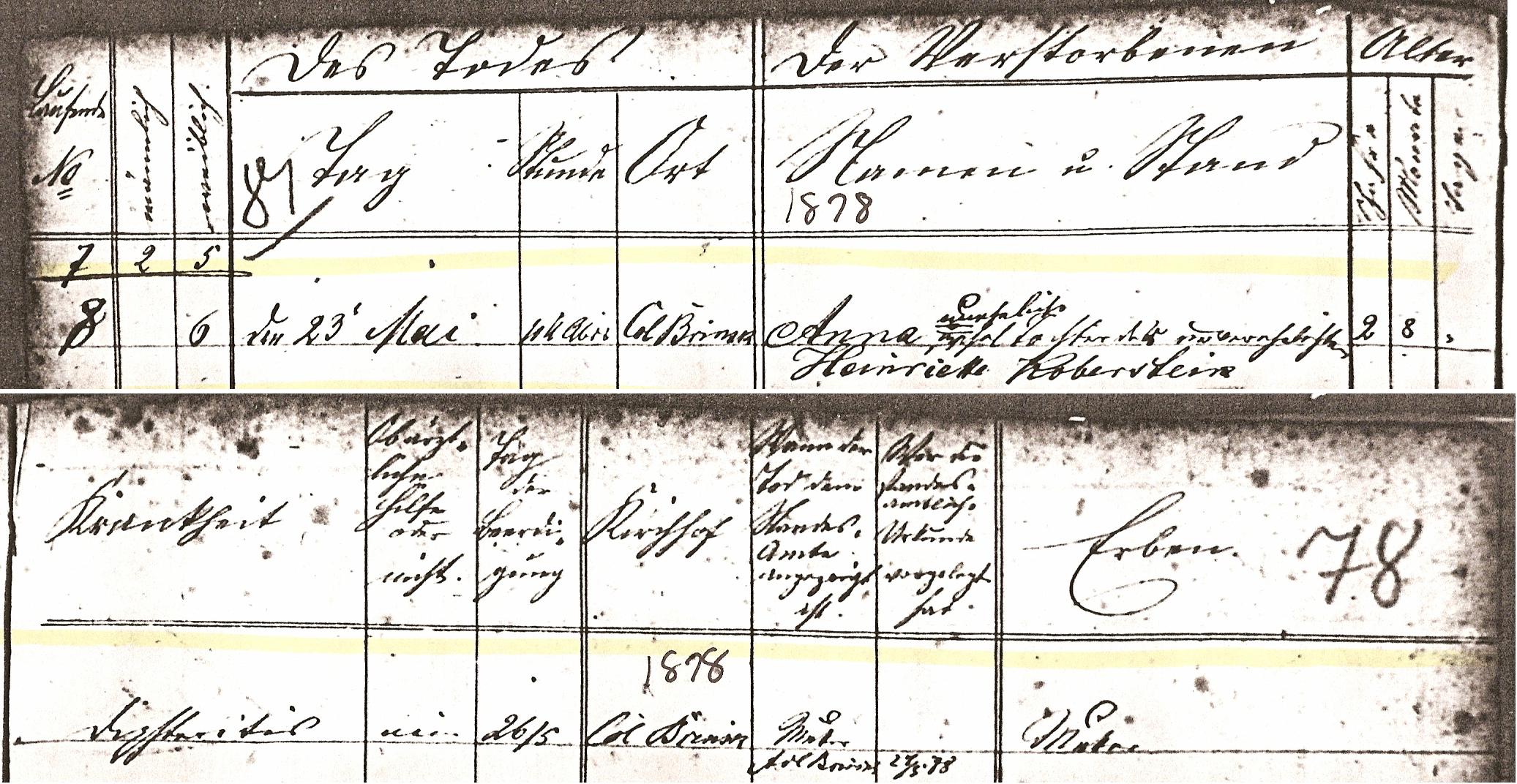 Anne KOBERSTEIN died on 23 May 1878 1 in Colonie Brinsk, Strasburg, West Prussia, Prussia, Germany 1. 85 M iii