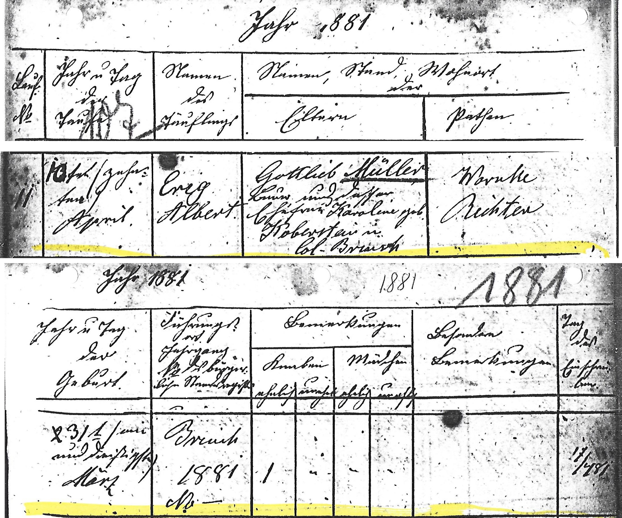 Erig Albert MÜLLER was born on 31 Mar 1881 1 in Colonie Brinsk, Strasburg, Prussia, West Prussia, Germany 1. He was christened on 10 Apr 1881 2 in Brinsk, Strasburg, West Prussia 2. He died on 20 Jun 1882 in Colonie Brinsk, Strasburg, Prussia, West Prussia, Germany.[Notes] 81 M iii