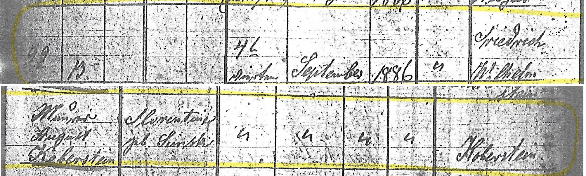 Matilde Augusta KOBERSTEIN was born on 20 Dec 1883 1 in Colonie Brinsk, Strasburg, West Prussia 1. She died on 12 Apr 1884 2 in Colonie Brinsk, Strasburg, West Prussia 2. She was buried 3 on 15 Apr 1884 in Colonie Brinsk, Strasburg, West Prussia.[Notes]