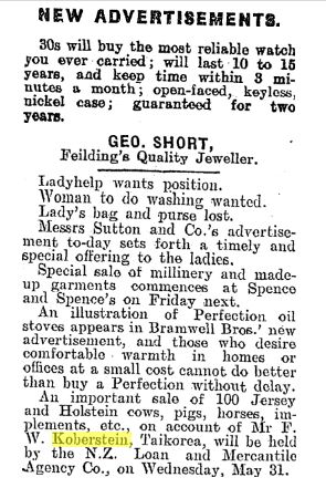 The following are some of the sales made by the New Zealand Loan and Mercantile Agency co. of interest to the Feilding distric: F. W. Koberstein 10d, ...