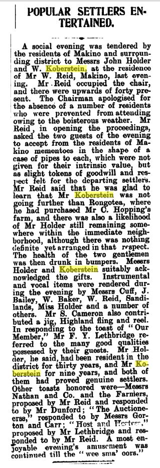 Feilding, New Zealand and citys round about found Frederick Wilhelm Koberstein Sr. and his descendents mentioned frequently in the local newspaper.
