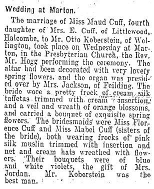 Ludwig married Maude Elizabeth CUFF, daughter of Edwin CUFF and Catherine MASTERSON "Kate", on 31 Aug 1911 in Marton, New Zealand. Maude was born on 24 Oct 1878 in Marton, Rangitikei, New Zealand. She died on 21 May 1970 in Palmerston North, Manawatu, New Zealand. She was buried on 25 May 1970 in Kelvin Grove Cemetery, Palmerston North. [Notes] |