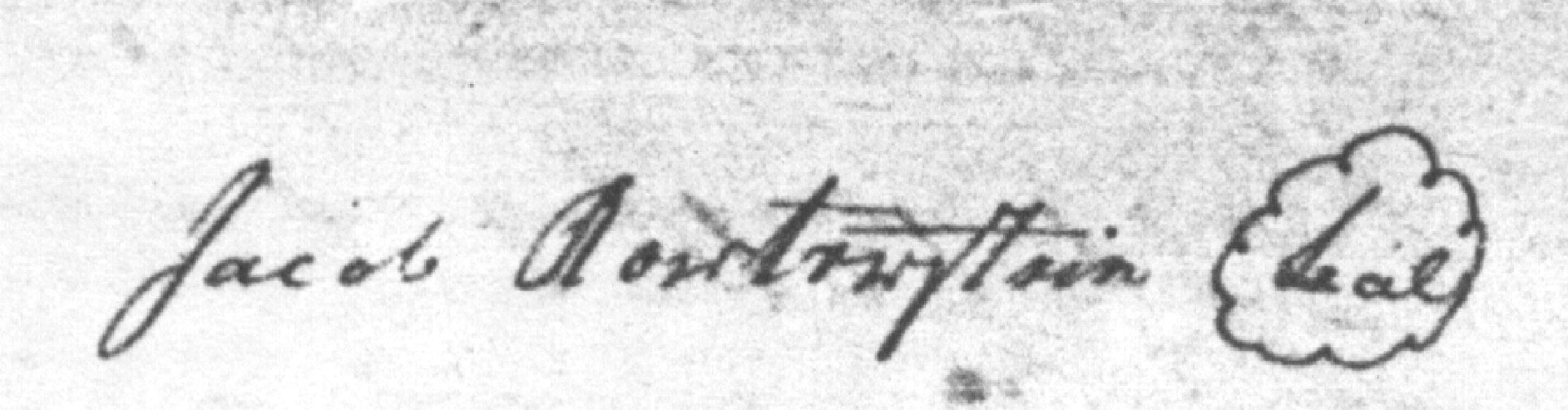 They would not allow me to make a copy of these signatures, stating it was hard on the book bindings and the harsh light degraded the paper. From book I, page 40, 1790 (Also listed as being at the Virginia Archives, reel 187 or 107) I found a record of land sold by Jacob to Samuel Norris. Jacob's signature is at the bottom of the record and no mark is given, suggesting that it was an original signature. I made my best forgery as below:
