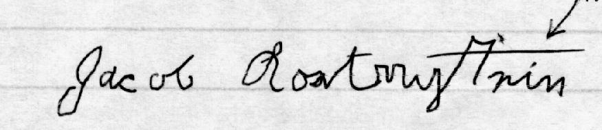 The Jacob is clear enough. The last name starts with a clear 'K', then an 'o'. the next letter is out of place if Koberstien is the correct signature. It will take more research, including a proper copy of the record to discover what it may be. Next is a 'b', but oddly the upstroke is crossed. Then there is a typical German script lower case 'e'. The German Script 'e' looks more like an 'n'. See the attached old German Script alphabet for comparison. Then comes an 'r'. This 'r' looks more like the regular english 'r' than a german script 'r' which is more like an english 'v'. However, I have seen cases of mixed english and german script letters. Next comes a German script 's' which is more like an english lower case cursive 'f'. It is followed by a clear crossed 't'. The upper loop on the german script 's' is compromised by the need to cross over to the downstoke of the 't'. Also the cross stroke of the 't' may have been made large and it skipped making the cross stroke on the up stroke of the 'b'. Next there is a clear german script 'e', which looks more like a english 'n'. Next we find a clear 'i', with a clean dot above the 'i'. Last there is a clear 'n'.